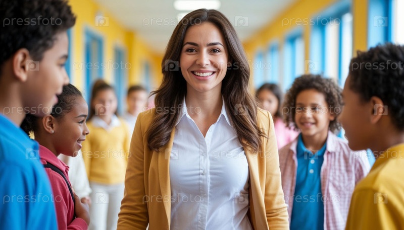 Учительница и счастливые ученики в школе. ИИ