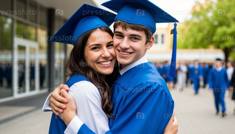 Двое выпускников счастливо обнимают друг друга, парень и девушка