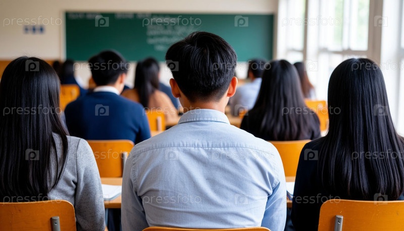 Азиатские студенты в классе, вид сзади. ИИ