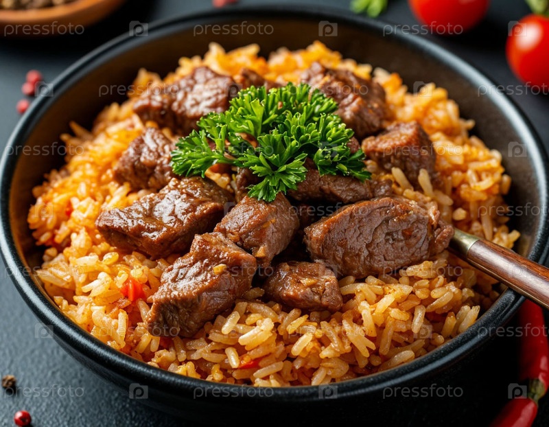 Пилаф с мясом на темном фоне крупным планом