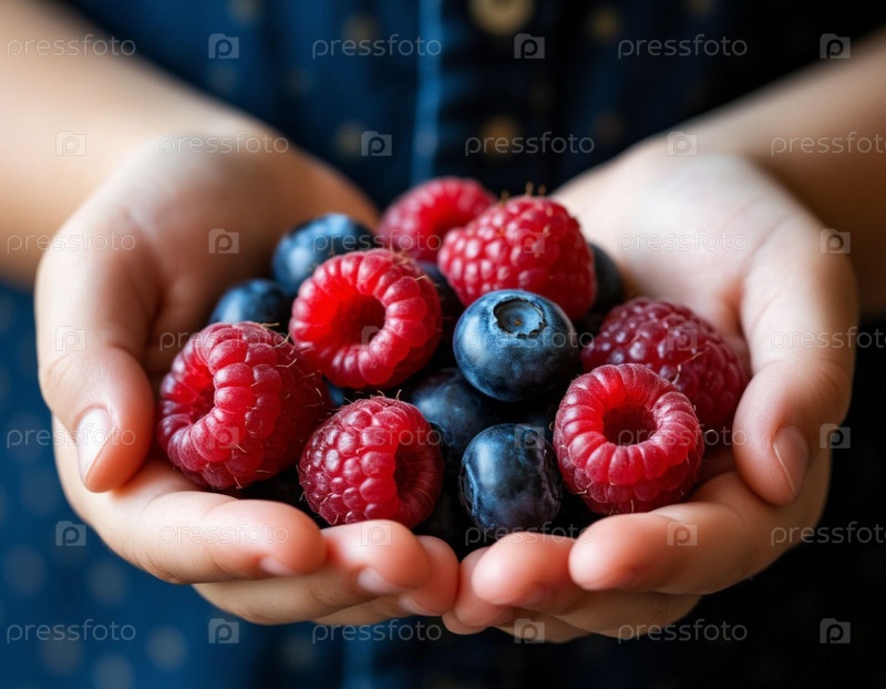 Детские руки, держащие ягоды на темном фоне. Генерируется ИИ