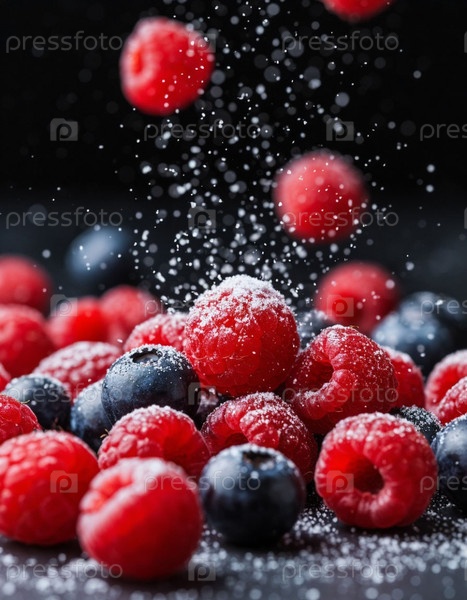 Ягоды посыпали сахаром на темном фоне. Сгенерированный ИИ