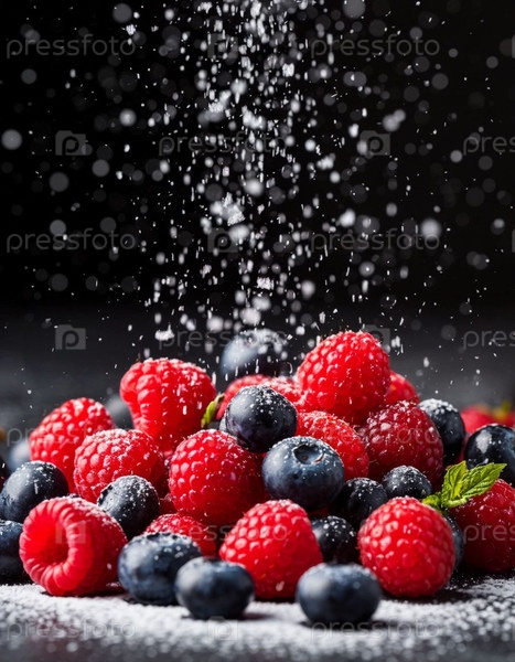 Ягоды посыпали сахаром на темном фоне. Сгенерированный ИИ