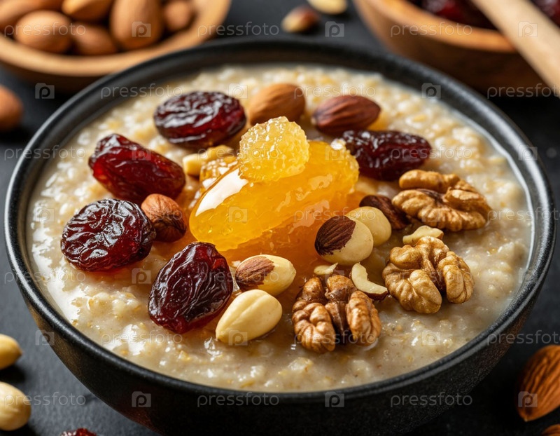 Каша с медом и сухофруктами на темном фоне