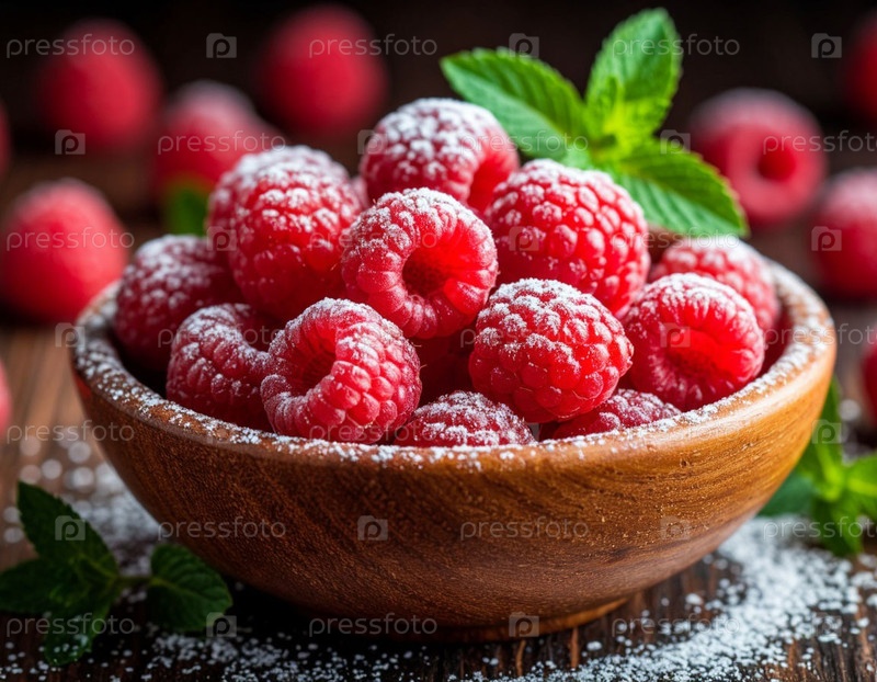Ягоды с сахаром в миске на темном фоне. Генерируется ИИ
