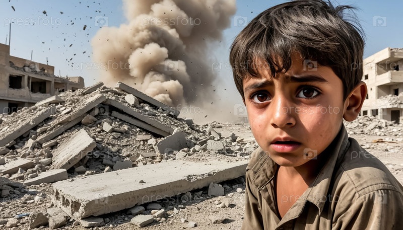 Война на Ближнем Востоке. Арабский ребенок боится и одинок в руинах здания