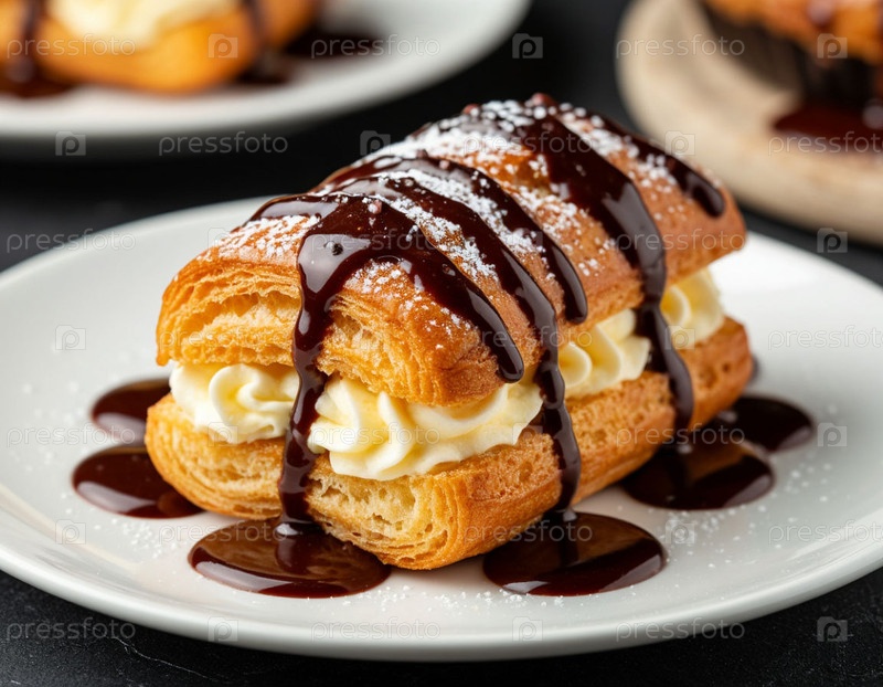 Торт Эклэра на тарелке. Сгенерированный ИИ