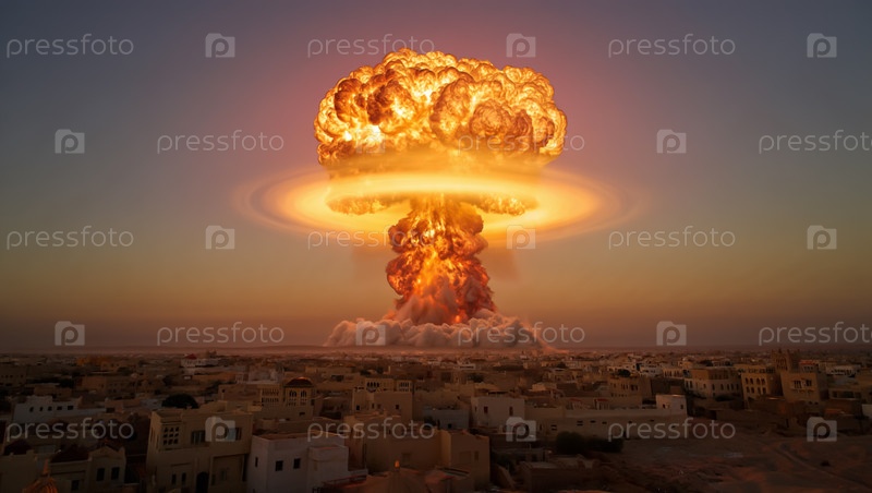 Ядерный взрыв грибного облака над ближневосточным городом. Военный или ядерный конфликт на Востоке