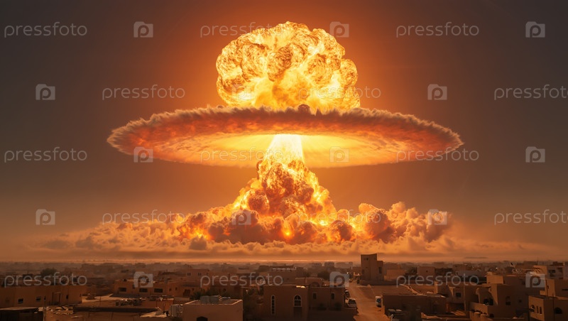 Ядерный взрыв грибного облака над ближневосточным городом. Военный или ядерный конфликт на Востоке