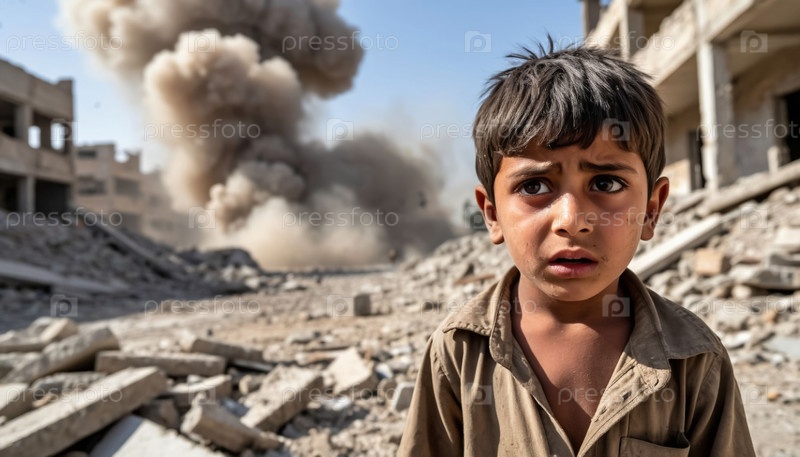 Война на Ближнем Востоке. Арабский ребенок боится и одинок в руинах здания