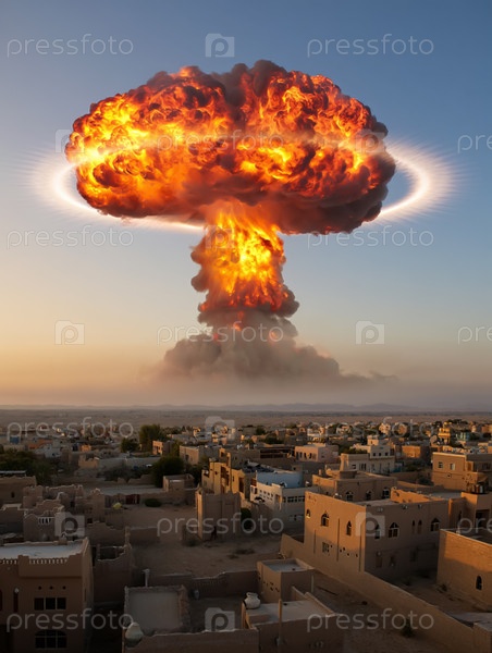Ядерный взрыв грибного облака над ближневосточным городом. Военный или ядерный конфликт на Востоке