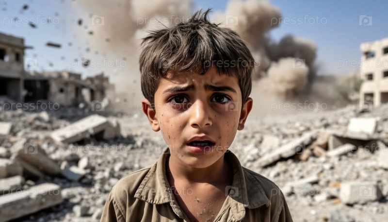 Война на Ближнем Востоке. Арабский ребенок боится и одинок в руинах здания