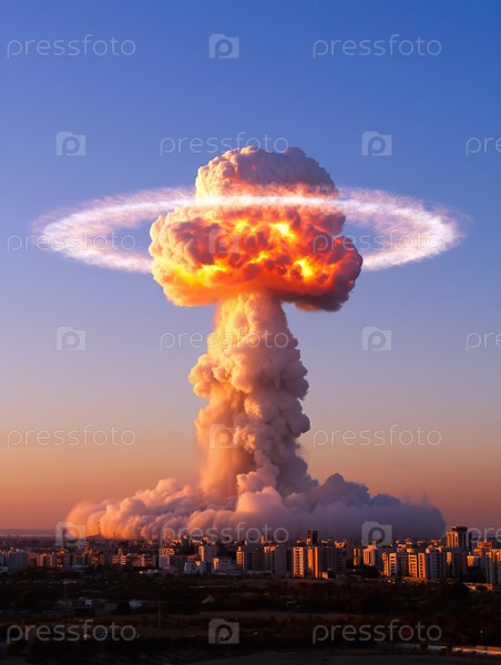 Ядерный взрыв грибного облака над ближневосточным городом. Военный или ядерный конфликт на Востоке