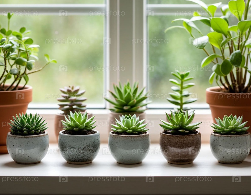 Суккуленты в керамических горшках на окне. Сгенерированный ИИ