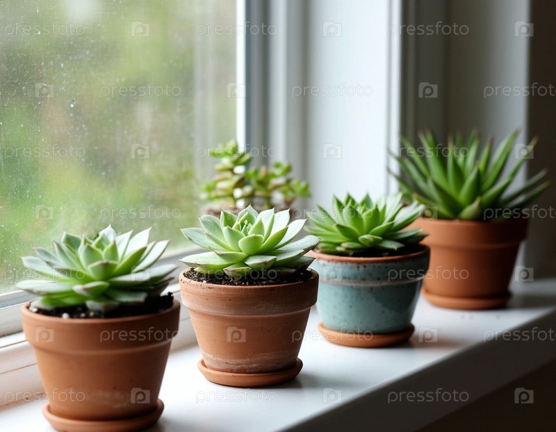 Суккуленты в керамических горшках на окне. Сгенерированный ИИ