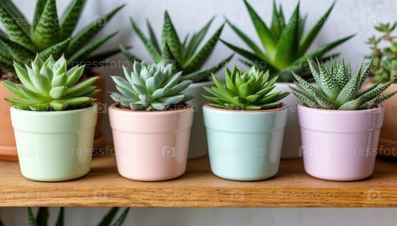Суккуленты в керамических горшках на деревянной полке. Сгенерированный ИИ