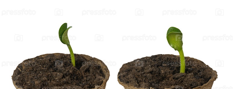 Семя тыквы прорастает из почвы в биоразлагаемом торфяном горшке. Макрофотография. Изолированный. Два угла