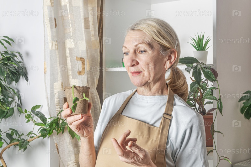 Пожилая женщина занимается своим хобби выращивания комнатных растений. Пенсионер осматривает растение в торфяном горшке