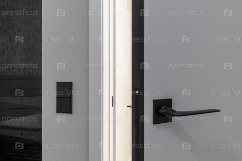 Закрытие современной белой двери с гладкой черной ручкой и оборудованием. Черный современный выключатель света установлен на соседней серой текстурированной стене. Чистый минималистичный дизайн интерьера новой квартиры