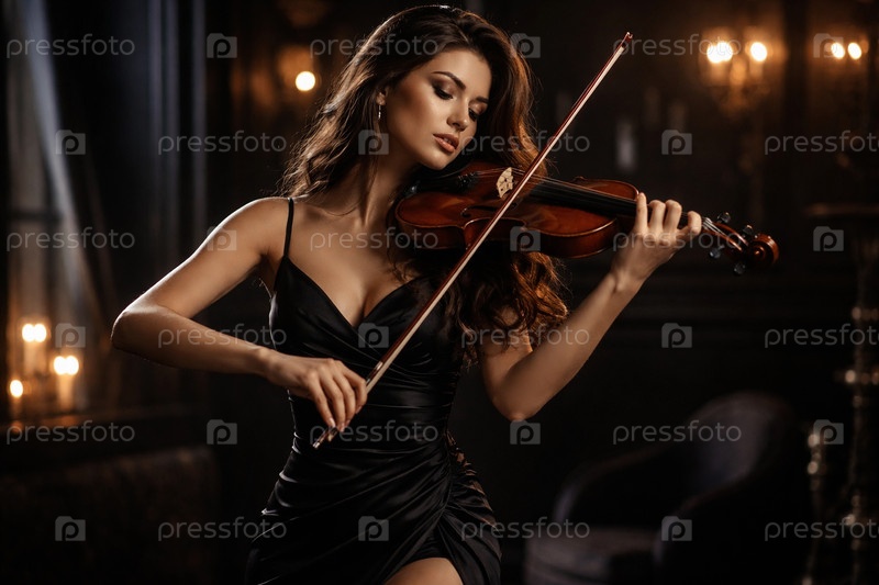 Соло скрипачка в элегантном вечернем платье: женщина играет на скрипке в роскошном интерьере со свечами и драматическим освещением