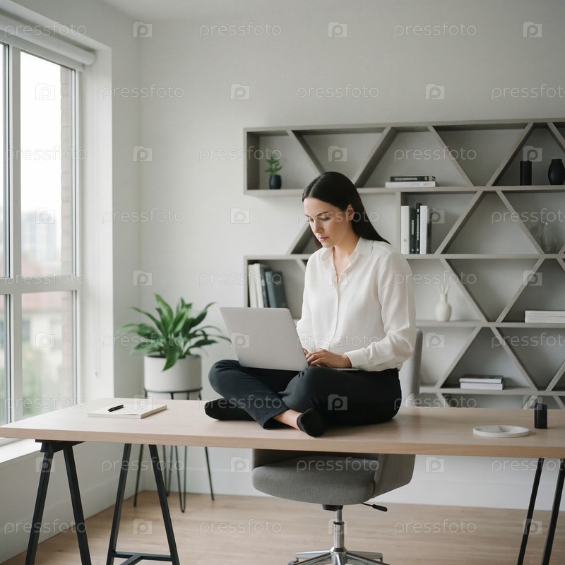 Деловая женщина работает на ноутбуке, сидя по-турецки на столе в светлом минималистичном домашнем офисе у окна с полками и комнатным растением