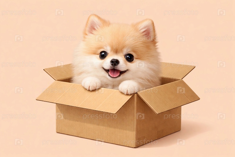 Пушистый щенок померанского шпица в картонной коробке на пастельном фоне — студийный портрет улыбающейся маленькой собачки
