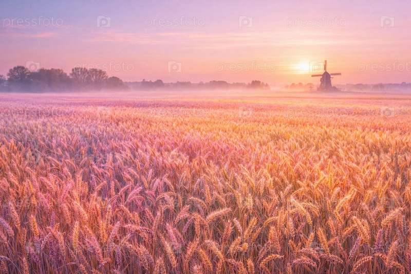 Пастельный рассвет над золотым полем пшеницы: туманное утро с силуэтом ветряной мельницы на горизонте