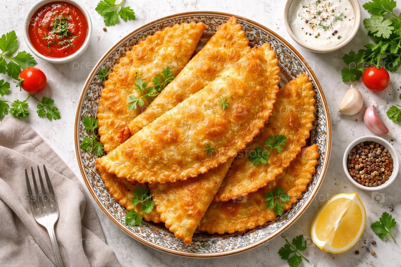 Жареные чебуреки с золотистой хрустящей корочкой на узорной тарелке с петрушкой, лимонной долькой и соусами — аппетитная домашняя восточноевропейская закуска, вид сверху