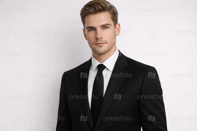 Профессиональный студийный портрет мужчины в классическом черном костюме и черном галстуке на нейтральном фоне — деловой образ в торс-кадре для корпоративных, маркетинговых и имиджевых материалов