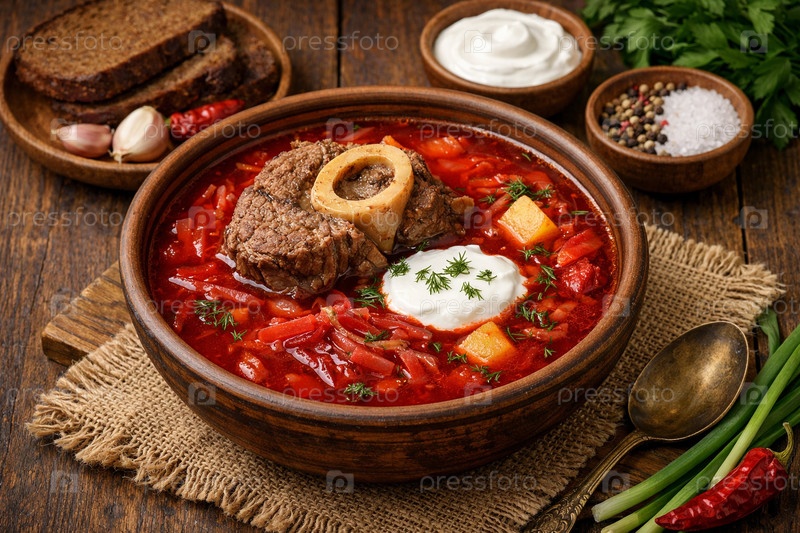 Традиционный борщ с говяжьей костью и костным мозгом в керамической миске, поданный со сметаной, укропом и ржаным хлебом на деревянном столе