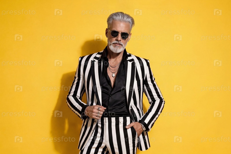Стильный мужской портрет в черно-белом полосатом костюме на ярко-желтом фоне — модный ретро-гламур с черной рубашкой и выразительными аксессуарами