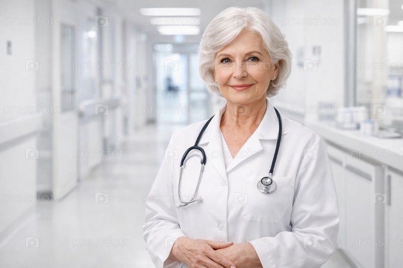 Опытная врач в белом халате со стетоскопом на шее в коридоре современной больницы — портрет медицинского специалиста и концепция здравоохранения