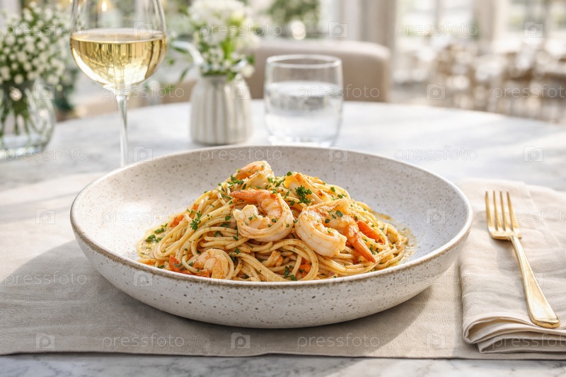 Спагетти, паста с креветками в легком соусе, поданные в керамической тарелке в элегантной ресторанной сервировке с бокалом белого вина
