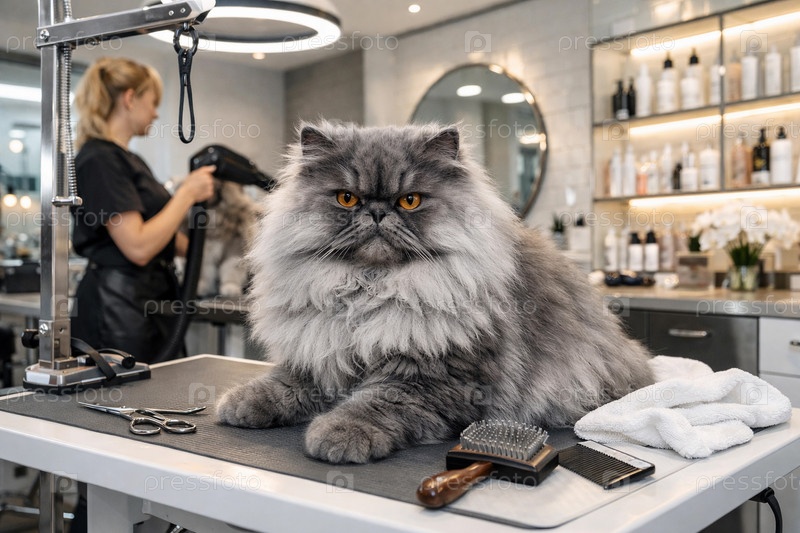 Пушистый серый персидский кот на столе грумера в салоне для животных с расческой, щеткой, ножницами и полотенцем — профессиональная сессия груминга в современном питомник-салоне