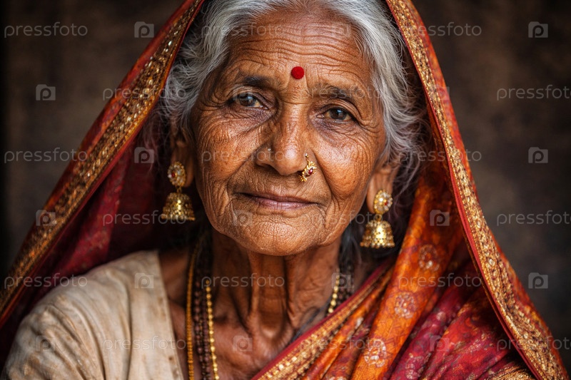 Крупный план пожилой женщины в традиционном сари с золотой вышивкой и украшениями — акцент на руках, шее, текстуре ткани и деталях ювелирных элементов