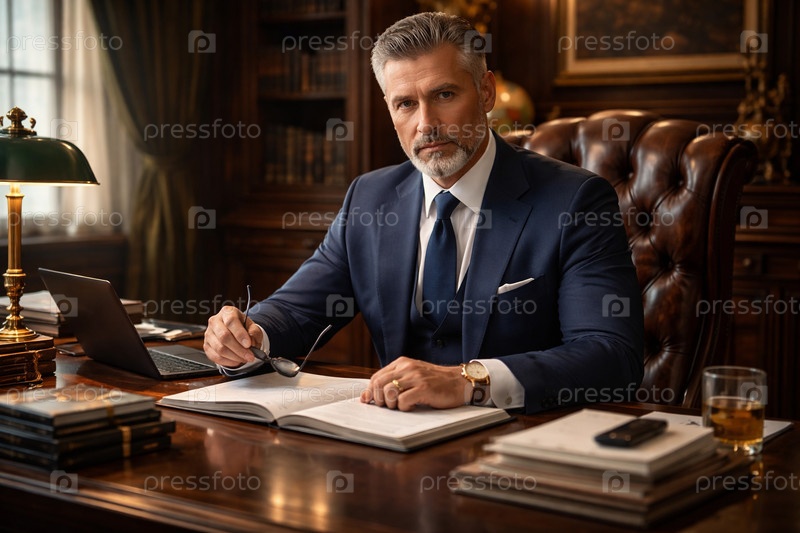 Детализованное название: Элегантный деловой кабинет в классическом стиле — человек в темно-синем костюме за кожаным письменным столом с открытым блокнотом, ноутбуком, настольной лампой, стопкой документов и стаканом напитка