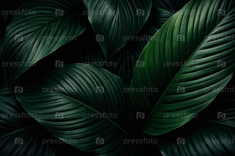 Темно-зеленые тропические листья в крупном плане с выразительной текстурой и контрастной светотенью — ботанический фон для дизайна