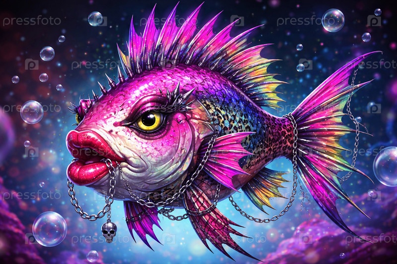 Фантастическая неоновая рыба с радужной чешуей и металлической цепочкой, яркая детализированная цифровая иллюстрация подводного фэнтези для стоковой фотографии