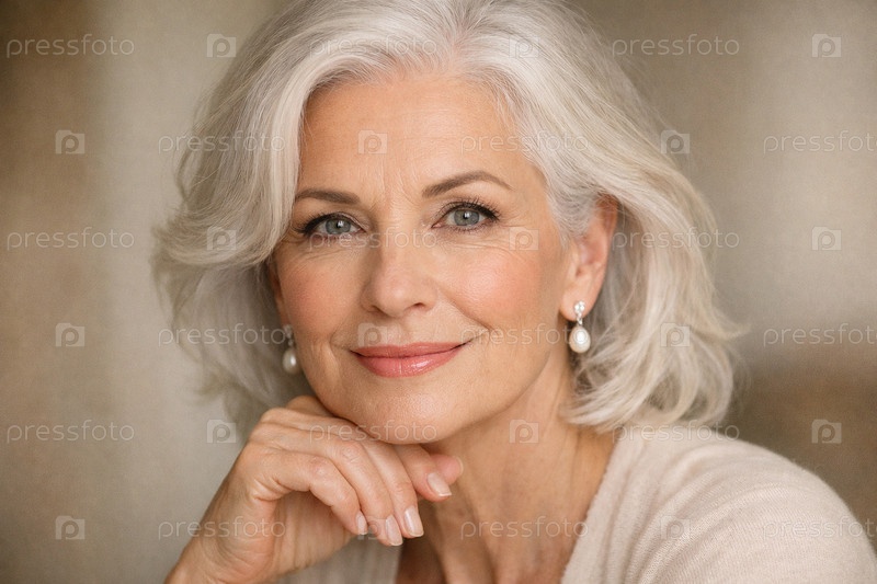 Портрет элегантной пожилой женщины в задумчивой позе: серебристые волосы средней длины, жемчужные серьги, рука, опирающаяся на подбородок, мягкий уютный свитер и нейтральный студийный фон — концептуальная фотосессия для стоковых изображений о зрелости, ст