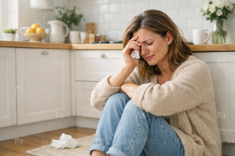 Одинокая женщина в уютной кухне: сидит на полу в свитере и джинсах рядом с использованными салфетками — эмоциональный момент грусти, усталости и размышлений в домашней обстановке