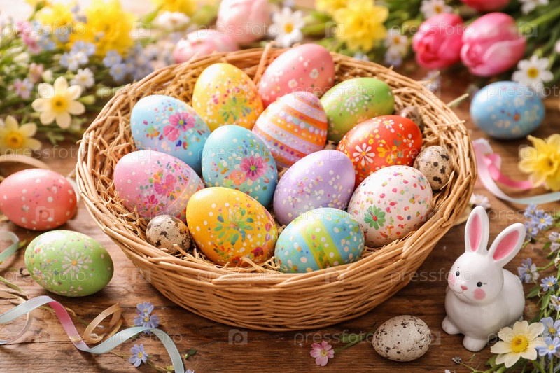 Праздничная весенняя композиция: плетеная корзина с разноцветными расписными пасхальными яйцами и перепелиными яйцами, керамический зайчик, цветы и ленты на деревянном столе