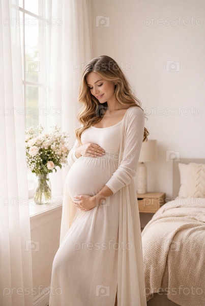 Будущая мама в кремовом длинном платье у окна в уютной светлой спальне с букетом цветов — атмосферная домашняя фотосессия материнства в мягком естественном свете, пастельные и бежевые тона, нежность и ожидание малыша
