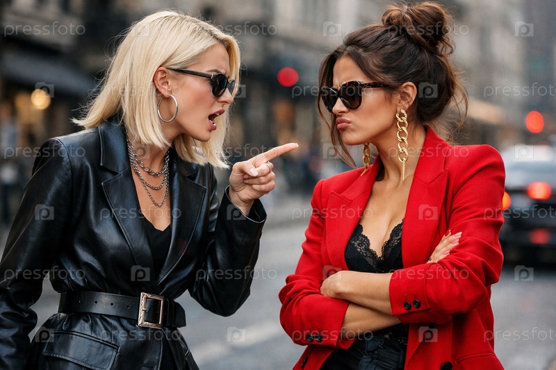 Две стильные женщины в урбанистическом окружении спорят на улице: одна в черном кожаном плаще указывает пальцем, другая в красном пиджаке и кружевном топе скрещивает руки, демонстрируя недовольство