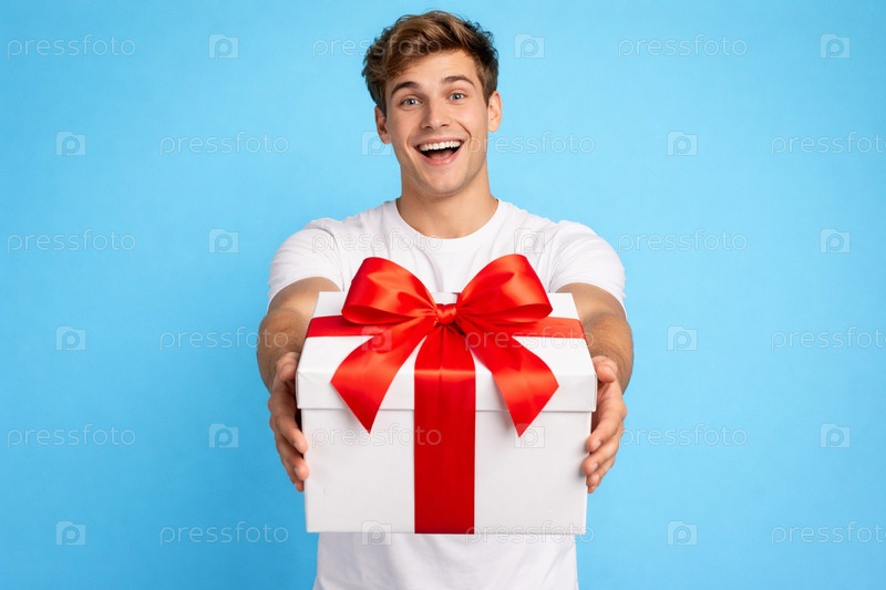 Молодой человек в белой футболке протягивает подарочную белую коробку с крупным красным бантом на синем фоне — концептуальная студийная фотография вручения подарка, сюрприз и праздничное настроение