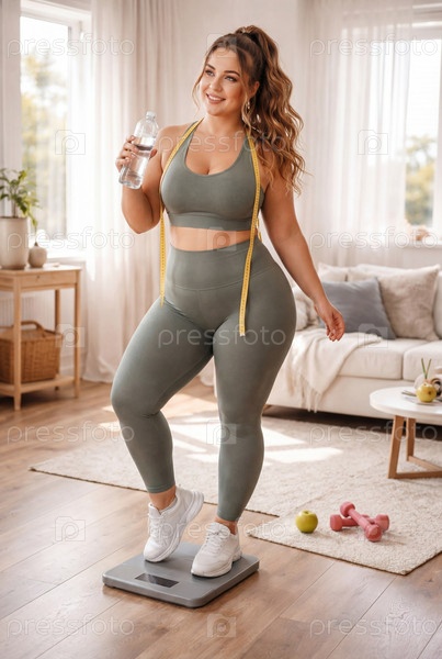 Молодая женщина с пышной фигурой в спортивном костюме стоит на весах в уютной гостиной с бутылкой воды и сантиметровой лентой — домашняя фитнес-сессия и забота о здоровье