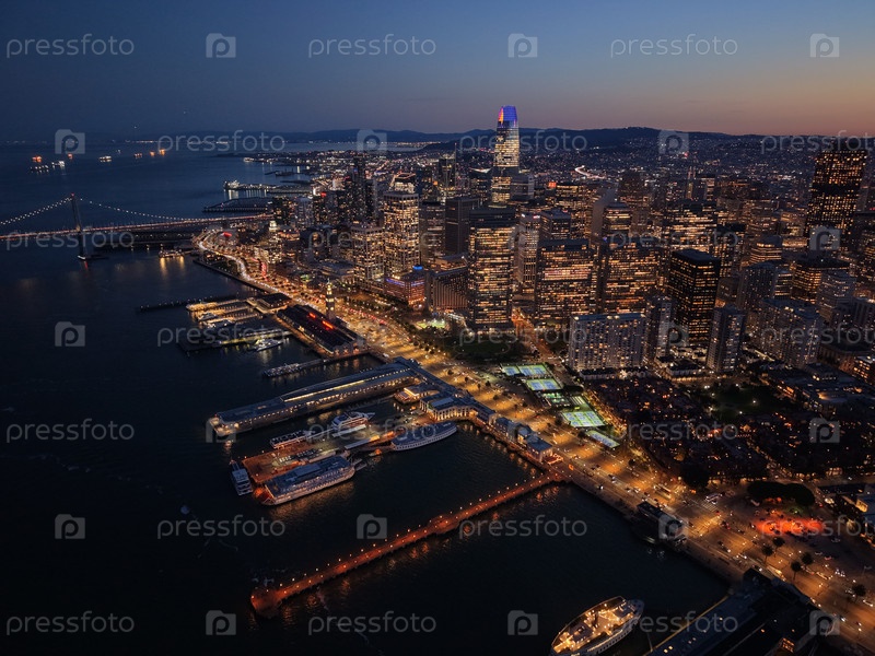 Сан-Франциско в центре горизонта и набережной Эмбаркадеро в синий час, Bay Bridge и Ferry Building вид с воздуха. г