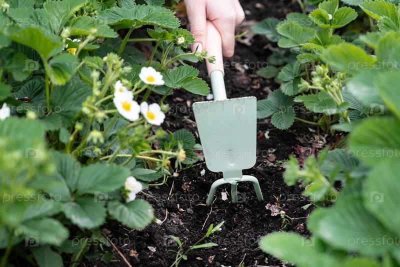 Человек использует небольшой ручной инструмент, чтобы ухаживать за клубничными растениями весной. Окружающая зелень включает цветы и здоровую листву, создавая яркую садовую сцену