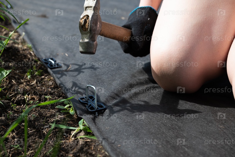 Человек, одетый в сапоги и перчатки, стоит на коленях на земле на клумбе, устанавливая ткань из черного сорняка с использованием оцинкованных стальных колышек и молотка. Концептуальный образ для самостоятельного озеленения, защиты от сорняков