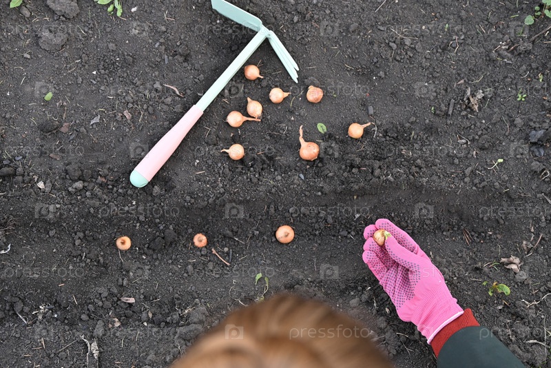 Женщина сажает лук в землю, чтобы вырастить лук. природа
