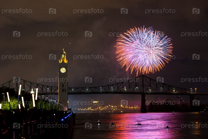 Монреальская часовая башня и мост Жака Картье с фейерверками ночью во время летнего праздника